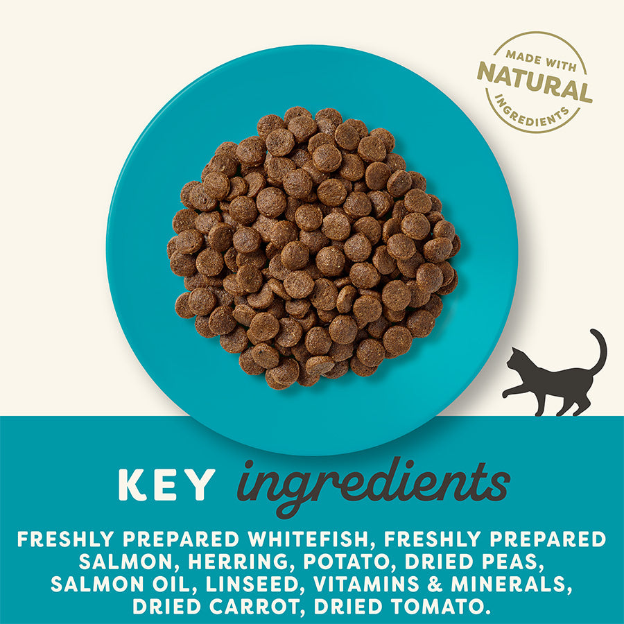 Ingrediënten: Oceaanvis 45,5% (vers bereide witte vis 18%, haringmeel 12%, vers bereide zalm 8%, vismeel 5%, zalmmeel 2,5%), aardappel, gedroogde erwten, zalmolie 5%, lijnzaad, gedroogde biergist, vissaus 2,5%, vitaminen en mineralen, bietenpulp, gedroogde wortel, gedroogde tomaat, cichorei-extract 0,2% (bron van prebiotische FOS), zeewier, Yucca Schidigera-extract, cranberrypoeder.