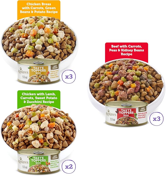 Laat jouw hond kennismaken met de nieuwe Applaws Dog Taste Toppers in Stew met dit voordelige multipack van 8 blikken à 156 g. Ideaal om verschillende smaken te proberen zonder een hele tray van één smaak te hoeven kopen. Dit multipack bevat drie verschillende toppers, speciaal ontwikkeld voor afwisseling en smaakplezier: