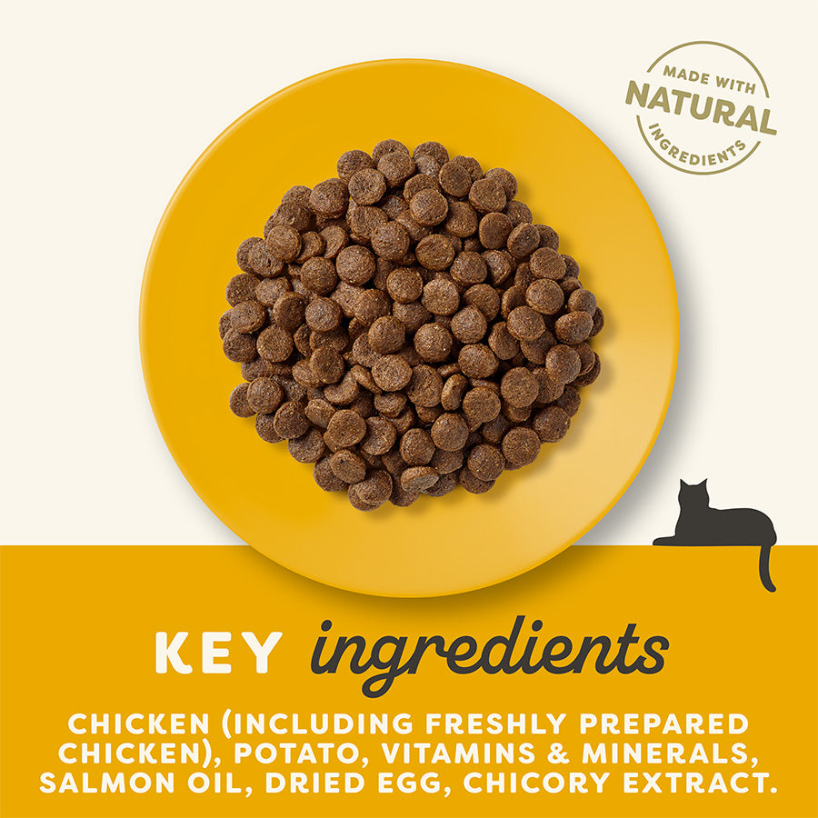 Ingrediënten: Kip 48% (kippenmeel 45%, vers bereide kip 3%), aardappel, pluimveevet 6%, bietenpulp, gedroogde biergist, vitaminen & mineralen, pluimveejus 1,5%, eipoeder, zalmolie, cichorei-extract 0,2% (bron van prebiotische FOS), zeewier, Yucca Schidigera-extract, cranberrypoeder. *Natuurlijke ingrediënten.