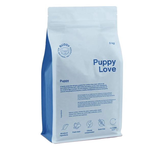 Met BUDDY – Puppy Love krijgt jouw pup de beste start. Dit stevige recept zit boordevol voedingsstoffen die bijdragen aan een gezonde groei en ontwikkeling. Met verse kalkoen en wild gevangen zalm als hoofdingrediënten krijgt je pup een smakelijke maaltijd die rijk is aan eiwitten, gezonde vetten en essentiële voedingsstoffen.