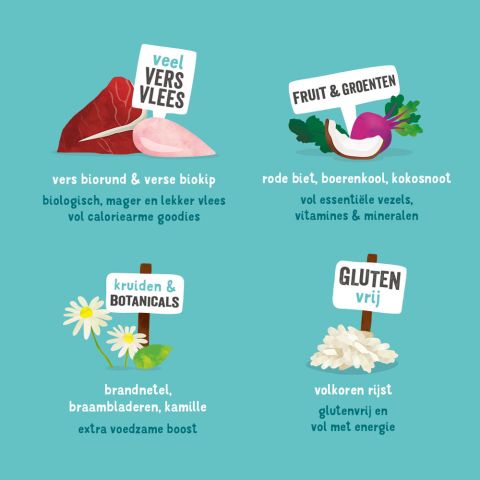 Ingredienten: *vervaardigd met producten afkomstig van 100% gecontroleerde biologische landbouw en veeteelt. Biologische verse kip* 25%, biologisch rijsteiwit*, biologische volkorenrijst*, biologische volkorengierst*, biologische volkoren haver*, biologische verse kalkoen* 5%, mineralen, biologische varkenssaus*, biologisch kippenvet*, biologische tomaat* 0,04%, biologische wortel* 0,04%, biologische peer* 0,04%, biologische appel* 0,04%, biologische chiazaden* 0,04%, biologische kokosnoot* 0,04%, biologische brandnetels*, biologische braambesblaadjes*, biologische venkel*, biologisch karwijzaad*, biologische kamille*, biologische melisse*