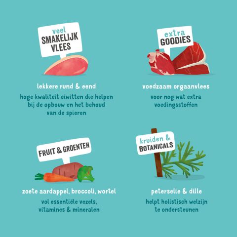 Om de voedingswaarde extra te boosten, voegen we voedzaam orgaanvlees toe, zoals hart en lever. Daarnaast bevat dit recept een supergezonde mix van fruit en groenten, aangevuld met smakelijke kruiden en botanicals. Alles wordt langzaam en zorgvuldig gegaard zodat de natuurlijke voedingsstoffen én de smaak optimaal behouden blijven.