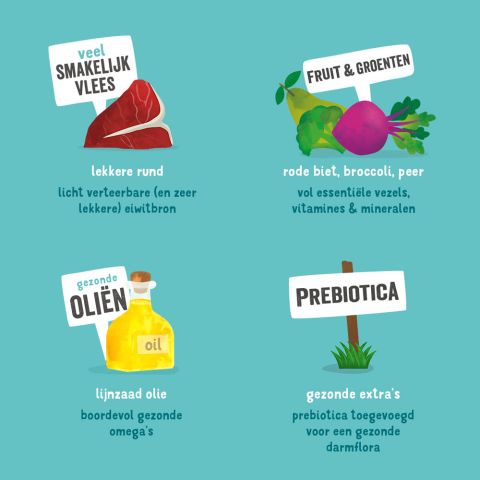Daarnaast is er prebiotica toegevoegd om de darmflora te ondersteunen. De maaltijd is verrijkt met een gezonde mix van biet, broccoli en peer, samen met lekkere kruiden en botanicals. Door de zachte bereiding blijven smaak en voedingsstoffen optimaal behouden.