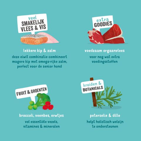 Dit graanvrije recept vol heerlijke kip en zalm is perfect afgestemd op de behoeften van oudere honden. Het zit boordevol magere eiwitten en is rijk aan omega 3-vetzuren – ideaal om het brein en de vitaliteit van je hond op leeftijd te ondersteunen.