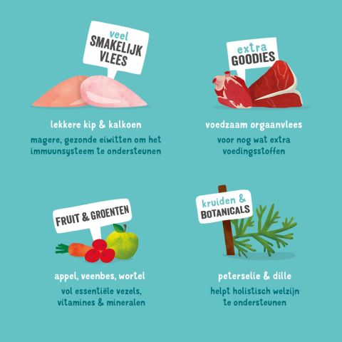 Een kuipje boordevol heerlijke kip en kalkoen! Dit graanvrije recept bevat véél hoogwaardige, magere eiwitten die bijdragen aan een gezond en vitaal hondenleven. Bovendien verrijken we het recept met extra voedzaam orgaanvlees, zoals hart en lever, voor een natuurlijke voedingsboost.
