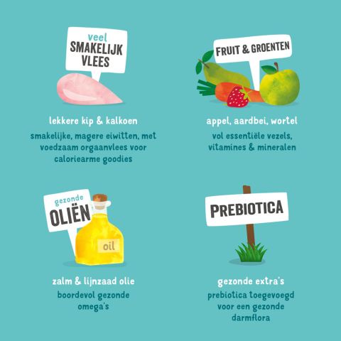 ✔️ Veel kip & kalkoen, verrijkt met hart en lever