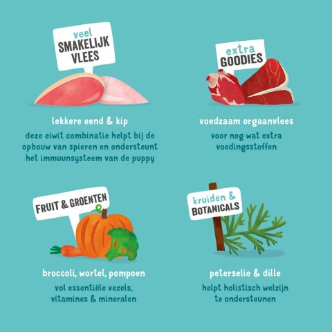 Dit graanvrije recept met heerlijke verse eend en kip is speciaal ontwikkeld voor opgroeiende pups. Het bevat veel hoogwaardige eiwitten die helpen bij het bouwen van sterke spieren en een gezond immuunsysteem. Als bonus wordt de voedingswaarde versterkt met extra voedzaam orgaanvlees (zoals hart en lever).