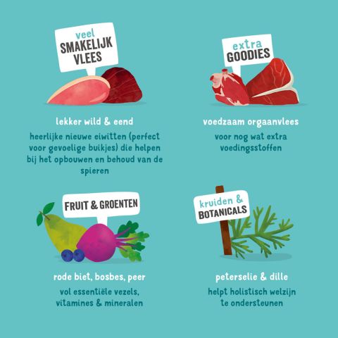 Dit graanvrije recept zit boordevol vlees. Wild en eend zijn unieke bronnen van hoogwaardige eiwitten, ideaal voor honden met een gevoelige maag. Bovendien is wild rijk aan omega 3, wat zorgt voor een superzachte, glanzende vacht. Om de voedingswaarde extra te boosten, voegen we voedzaam orgaanvlees toe, zoals hart en lever. Daarnaast bevat dit recept een supergezonde mix van fruit en groenten, aangevuld met smakelijke kruiden en botanicals. Alles wordt langzaam en zorgvuldig gegaard zodat de natuurlijke voedingsstoffen én de smaak optimaal behouden blijven.