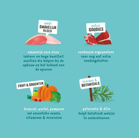 Ingredienten: kip 30%, kalkoen 26%, mineralen, wortels 2%, cranberry's 1%, tomaten 1%, pompoen 1%, appels 1%, peterselie 0,1%, dille 0,1%. Samenstelling: wild 30%, eend 26%, mineralen, wortels 2%, bataten 1%, rode bieten 1%, cranberry's 1%, appels 1%, peterselie 0,1%, dille 0,1%. Samenstelling: lam 30%, rund 26%, mineralen, wortels 2%, broccoli 1%, rode bieten 1%, appels 1%, spinazie 1%, peterselie 0,1%, dille 0,1%.