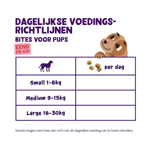 Voor nieuwsgierige en leergierige pups zijn de Puppy Bites Duck een ideale snack. Deze zachte bites zijn speciaal ontwikkeld om beloningen tijdens het trainen of leerzame momenten extra lekker te maken.