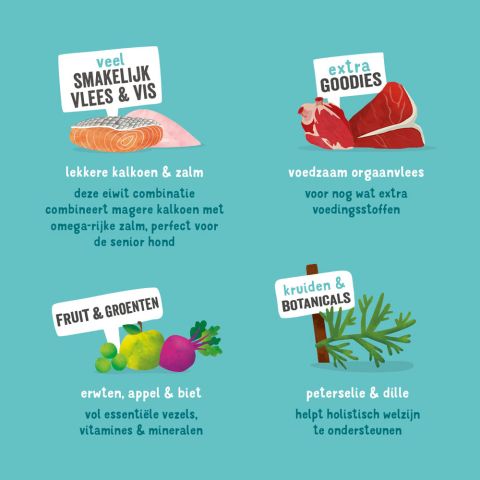 Ingredienten: kalkoen 46%, zalm 10%, wortel 2%, erwten 2%, mineralen, appel 1%, rode bieten 1%, peterselie (gedroogd) 0,1%, dillee (gedroogd) 0,1%.