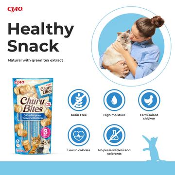Inaba Churu Bites Chicken Wraps Tuna with Scallop zijn onweerstaanbare kattensnacks met een dubbele textuur. Elke zachte, kussenvormige bite bestaat uit een luchtig gebakken kippenpastaomhulsel zonder granen, conserveringsmiddelen, carrageen of kunstmatige kleurstoffen. In de kern zit de heerlijke, romige Churu-vulling met tonijn en coquille, wat zorgt voor een unieke smaakervaring waar zelfs de meest kieskeurige kat niet aan kan weerstaan.