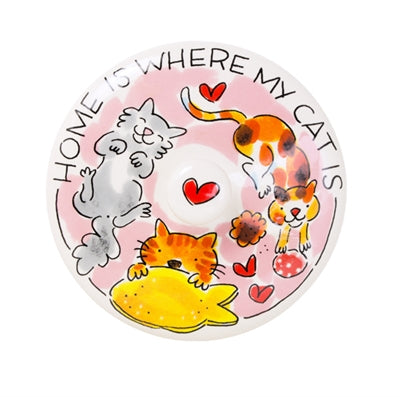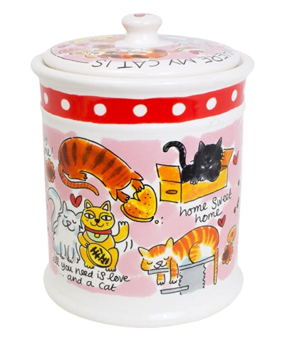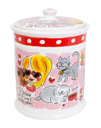 Deze leuke voorraadpot vrolijkt gelijk de hele ruimte op! De aardewerken pot is uitgevoerd in de bekende Blond Amsterdam-stijl, met een vrolijke opdruk van diverse katten en leuke tekstjes. De voorraadpot is wit met een blauwe achtergrond en rode band. Ook op het deksel is een leuke opdruk geplaatst. De voorraadpot is magnetron en vaatwasser bestendig en mag niet ontbreken in elk dierenhuishouden!