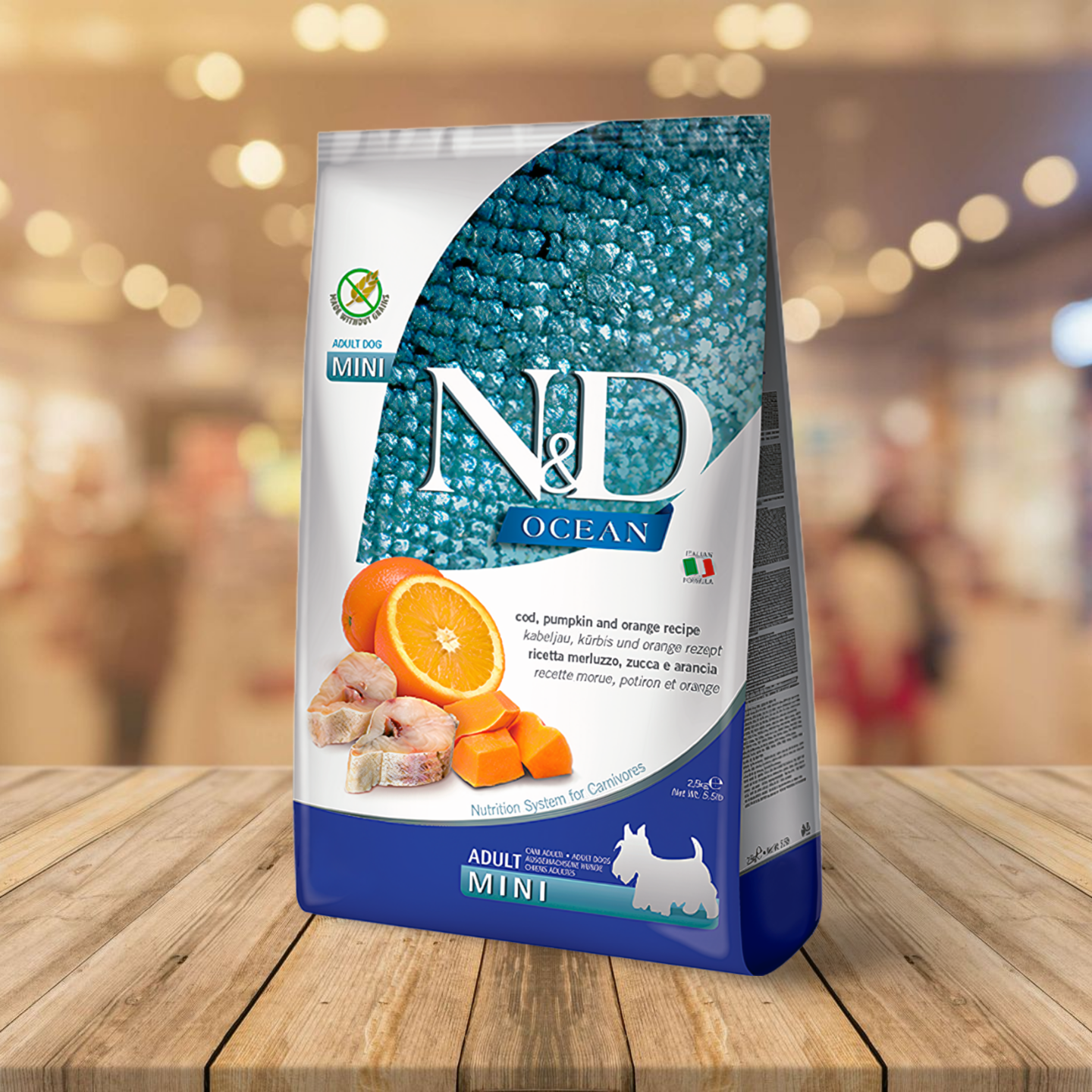Ingrediënten: zalm (20%), gedehydrateerd zalmeiwit (20%), bataten, kabeljauw (10%), gedehydrateerd kabeljauwproteïne (10%), visolie (van haring), gedehydrateerd haringproteïne, erwtenvezel, gedroogde wortelen, luzernemeel, inuline, fructo-oligosachariden, gistextract (bron van manno-oligo-sacchariden), gedroogde meloen (0,5%), gedroogde bosbessen, gedroogde appel, gedroogde spinazie, psylliumschillen en -zaden, gedroogde granaatappel, natriumchloride, kaliumchloride, gedroogde biergist, kurkuma (0,2%), aloë vera-extract, glucosamine, chondroïtinesulfaat.