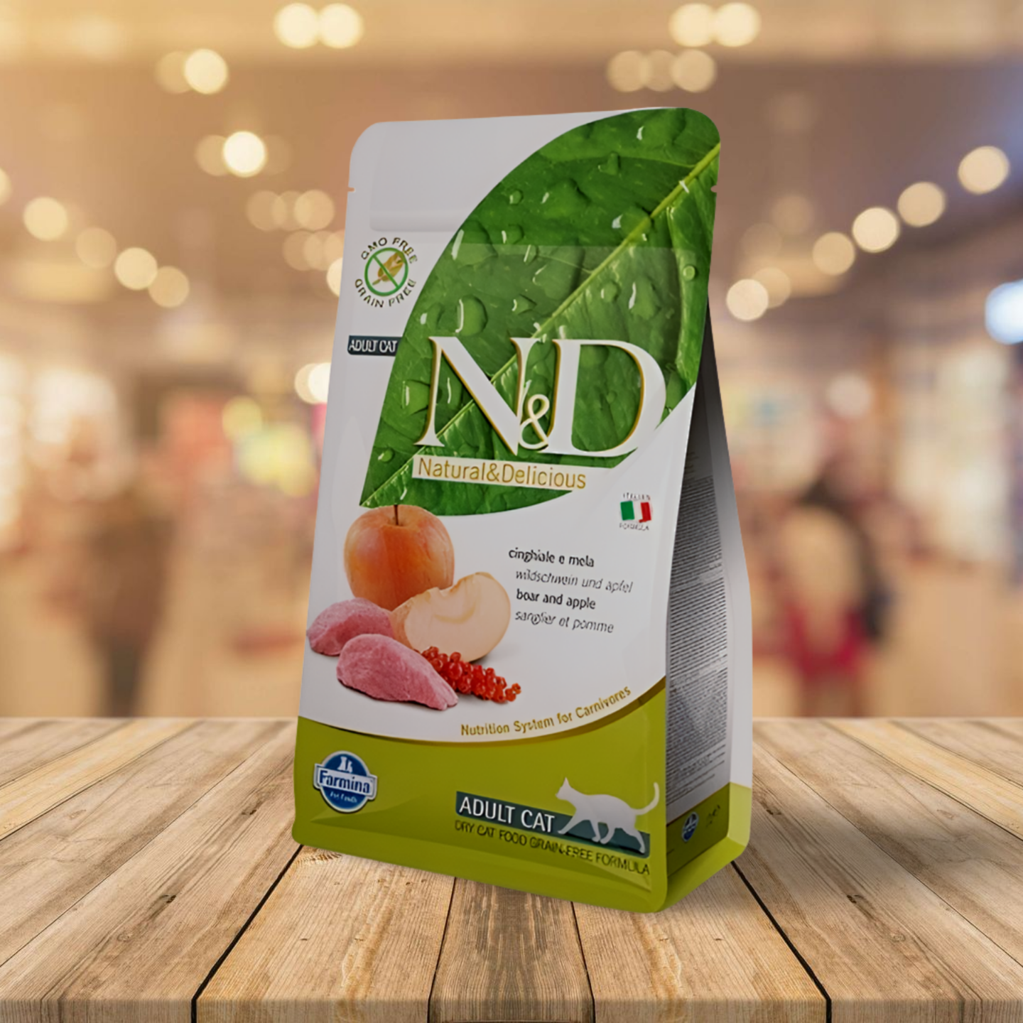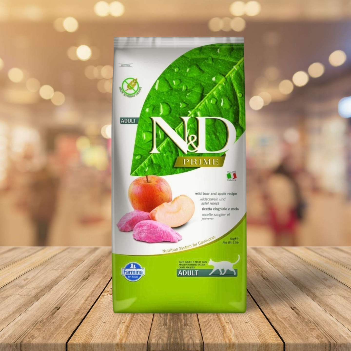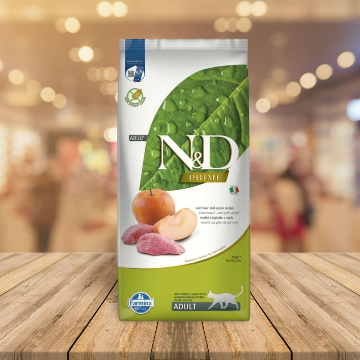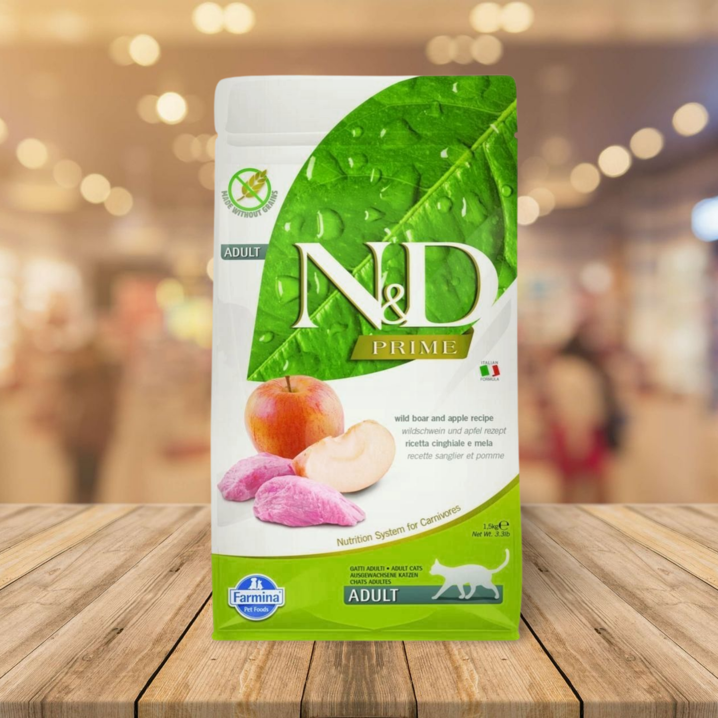 De N&D Prime Wild Boar & Apple is een hoogwaardige, graanvrije voeding die speciaal is afgestemd op de natuurlijke carnivore behoeften van katten. Dit recept bevat een hoog aandeel dierlijke eiwitten – maar liefst 98% van dierlijke oorsprong – en levert zo de perfecte ondersteuning voor spieropbouw, vitaliteit en gezondheid. Met een uitgebalanceerde mix van 70% dierlijke ingrediënten en 30% groenten, fruit, vitaminen en mineralen biedt dit voer een gezonde en smakelijke maaltijd voor jouw kat.