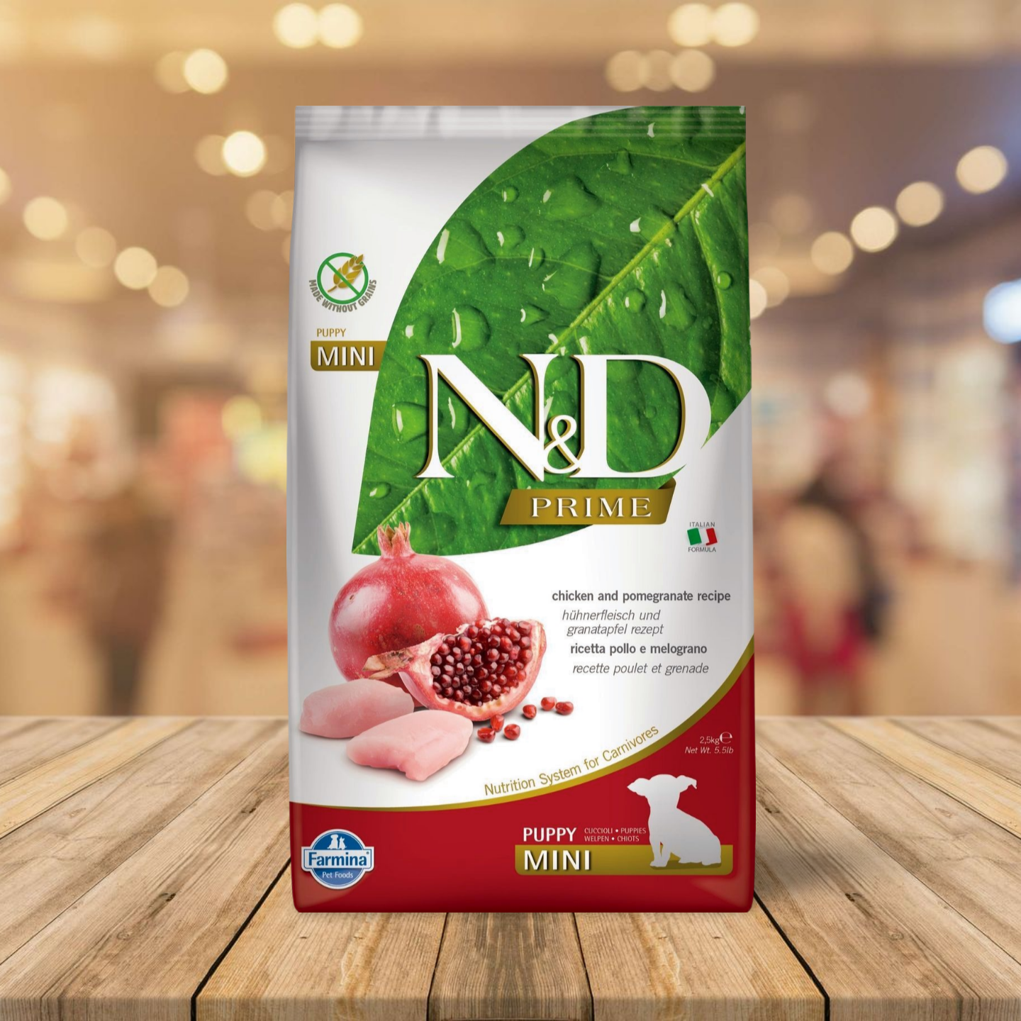 N&D Prime Chicken Puppy Mini is speciaal ontwikkeld voor pups van kleine hondenrassen. Deze graanvrije voeding bestaat voor 70% uit dierlijke ingrediënten (waarvan kip het hoofdingrediënt is) en 30% uit groenten, fruit, vitamines en mineralen. Zo krijgt jouw pup een complete, voedzame start in het leven.