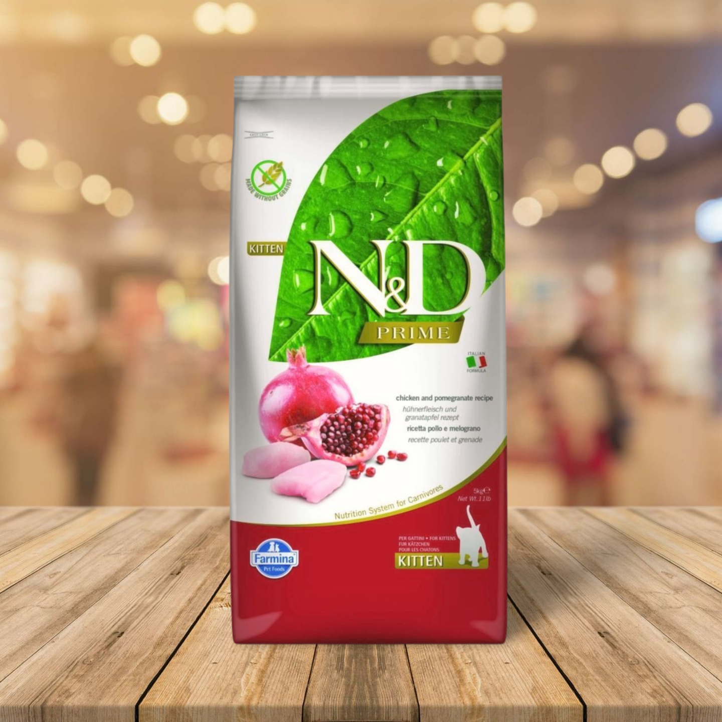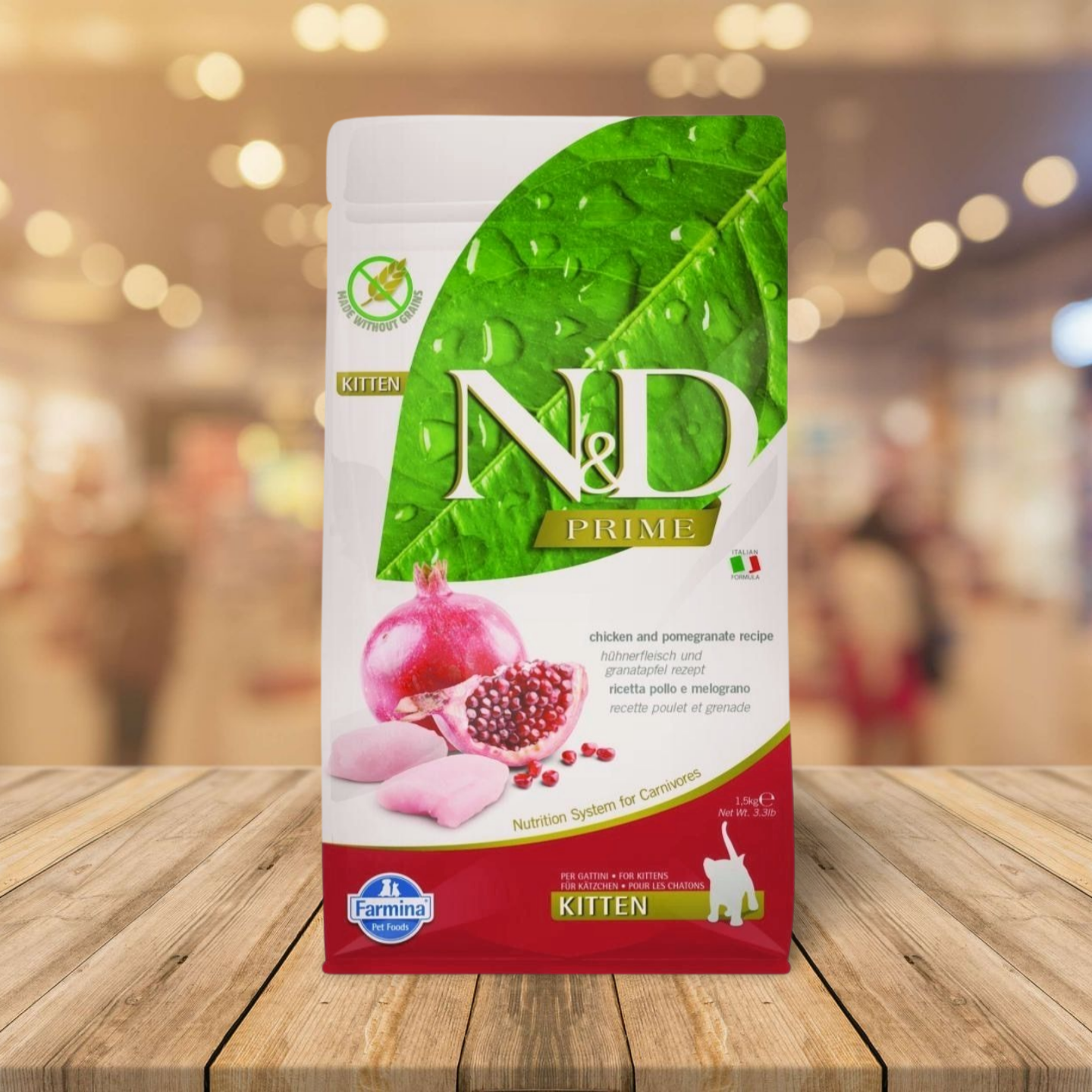 De N&D Prime Kitten Chicken & Pomegranate is speciaal ontwikkeld voor kittens vanaf 8 weken tot 12 maanden (bij grote rassen tot 16 maanden) én voor drachtige of zogende poezen. Dit hoogwaardige, graanvrije recept heeft een hoge energiedichtheid en een eiwitgehalte waarvan 98% van dierlijke oorsprong is. Daarmee sluit het perfect aan bij de natuurlijke carnivore behoeften van katten. Met 70% dierlijke ingrediënten en 30% groenten, fruit, vitaminen en mineralen biedt dit voer een perfect uitgebalanceerde maaltijd voor een gezonde groei en ontwikkeling.
