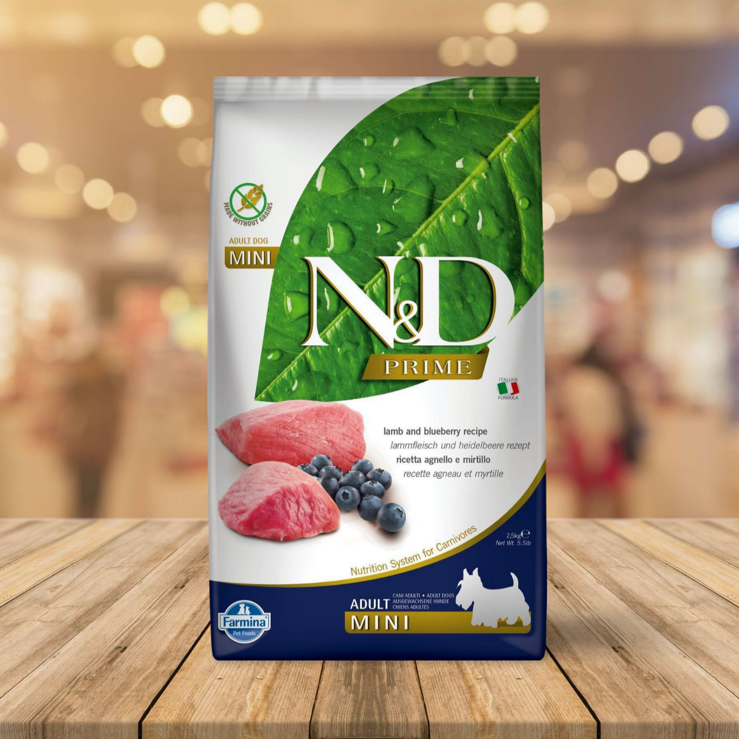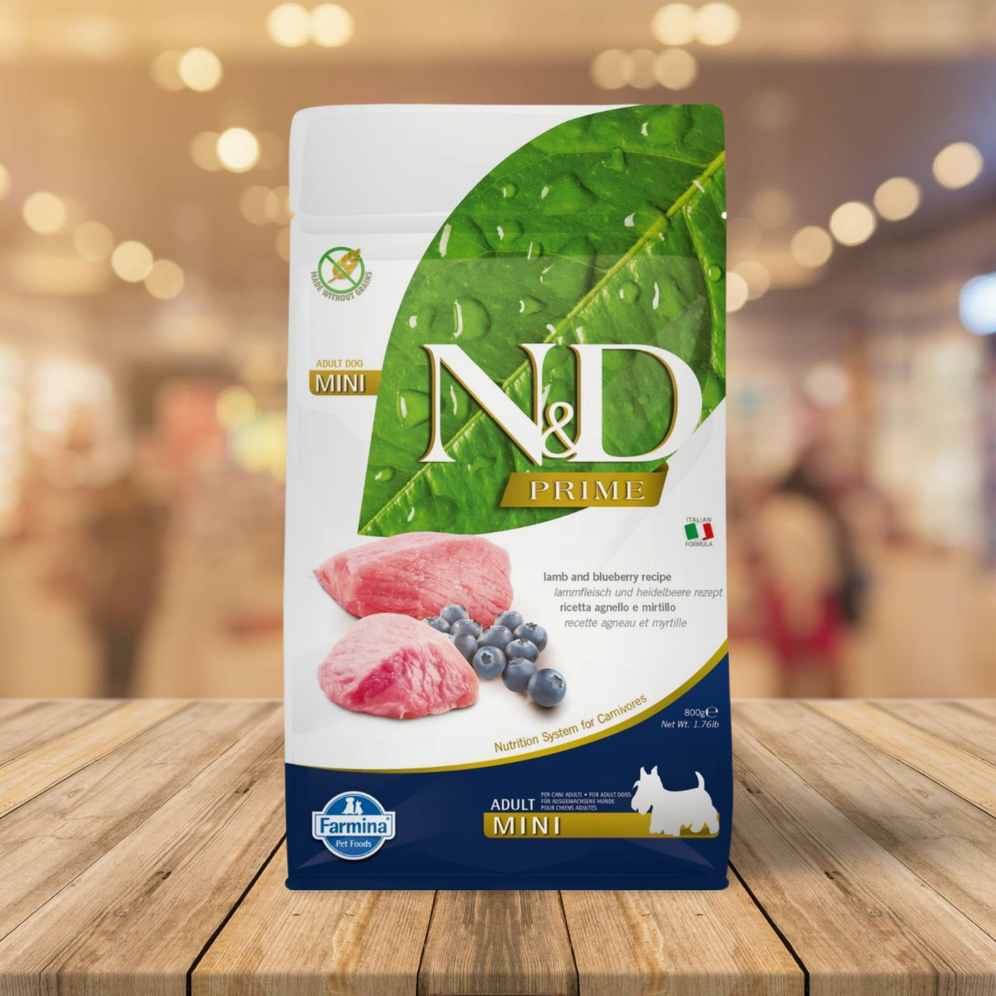 N&D Prime Lamb Adult Mini is een graanvrije voeding die granen vervangt door hoogwaardige dierlijke eiwitten. De voeding bestaat uit 70% dierlijke ingrediënten en 30% groenten, fruit, vitamines en mineralen, ideaal voor de dagelijkse gezondheid van jouw kleine hond.