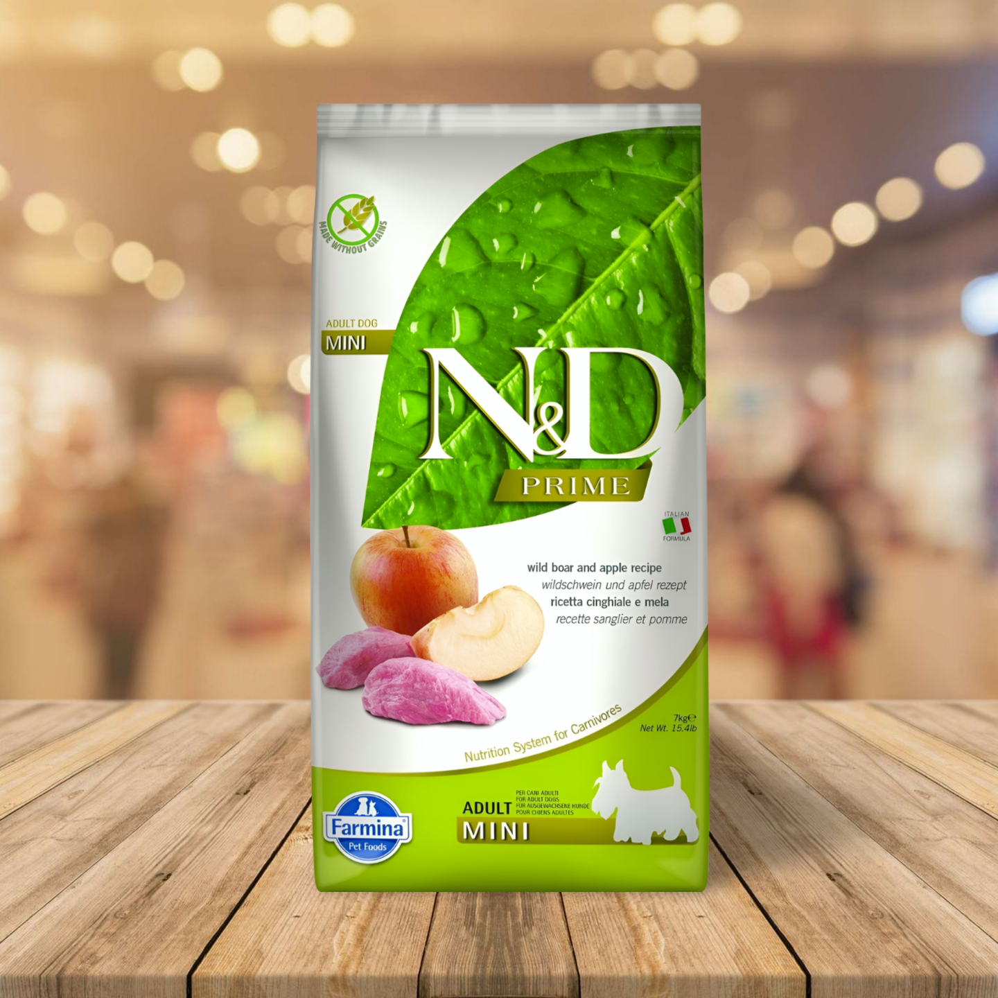 N&D Prime Wild Boar Adult Mini is een graanvrije hondenvoeding die granen vervangt door hoogwaardige dierlijke eiwitten. De voeding bestaat uit 70% dierlijke ingrediënten en 30% groenten, fruit, vitamines en mineralen, voor optimale gezondheid en vitaliteit.