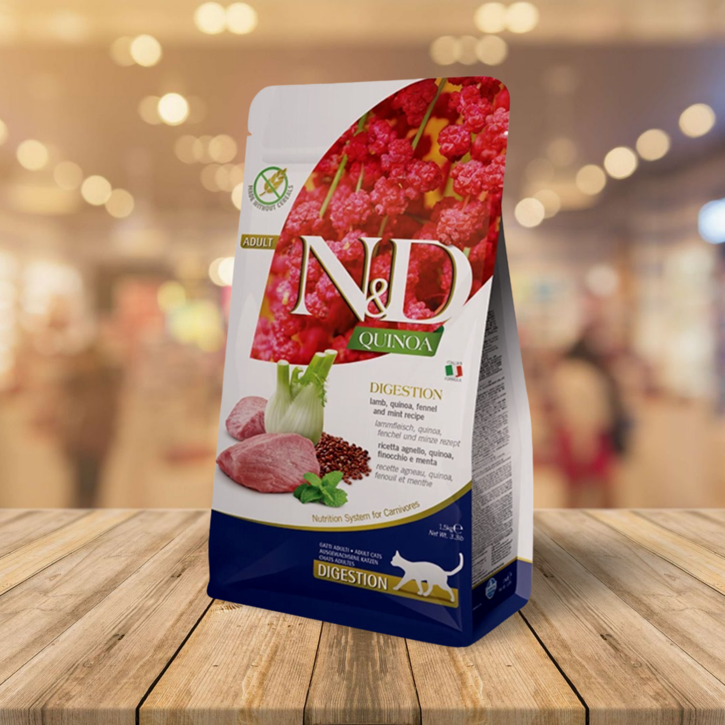 De N&D Quinoa Digestion Lam is speciaal ontwikkeld voor katten met spijsverteringsproblemen zoals misselijkheid, braken, diarree of zachte/stinkende ontlasting. Dit recept is graanvrij, zeer goed verteerbaar en bevat 92% eiwit van dierlijke oorsprong, waardoor het de natuurlijke carnivore behoeften van katten ondersteunt. Biologische quinoa draagt bij aan een gezonde spijsvertering en darmfunctie, is rijk aan essentiële aminozuren en antioxidanten en zorgt voor een geleidelijke energieafgifte.