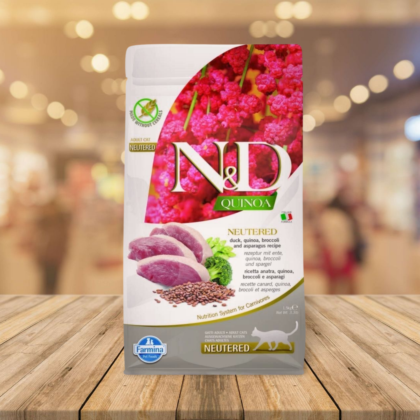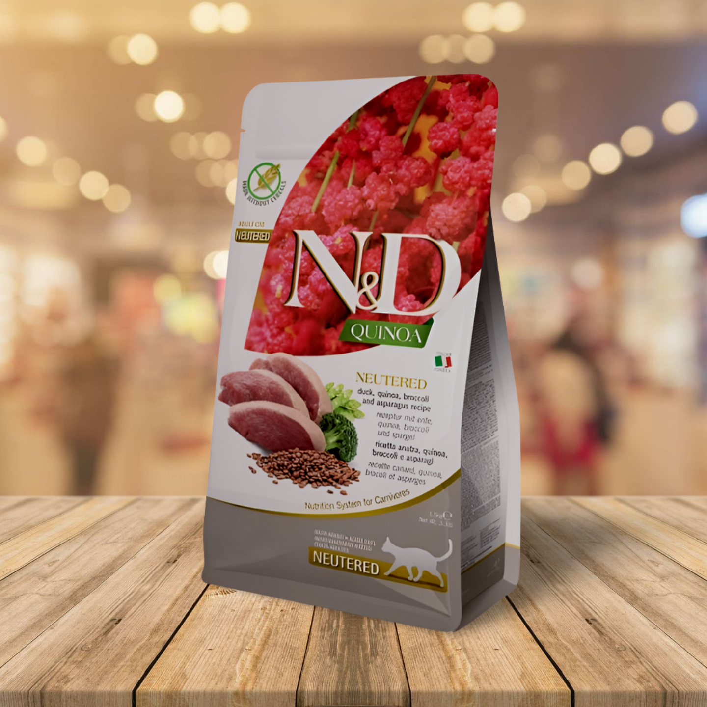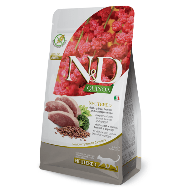 De N&D Quinoa Neutered Cat Duck is speciaal ontwikkeld voor volwassen, gesteriliseerde katten. Na sterilisatie hebben katten vaak de neiging om sneller aan te komen, daarom bevat dit recept verminderde calorieën, veel hoogwaardig dierlijk eiwit en een hoog vezelgehalte. Dit helpt bij het behouden van een gezond gewicht, ondersteunt de spijsvertering en geeft een verzadigd gevoel. Daarnaast bevat het voer een urineverzurende werking, die helpt om de pH-waarde van de urine in balans te houden en zo de urinewegen gezond te houden.