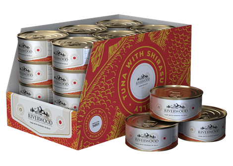 Voedingsadvies: Geef tot 2 blikjes per dag als aanvullende voeding naast Riverwood droogvoer.