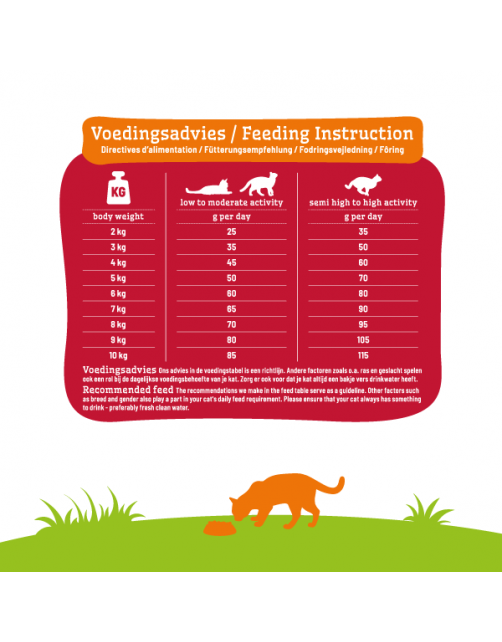 Analytische bestanddelen: eiwit 32%, vetgehalte 16%, ruwe as 8,5%, ruwe celstof 5,5%, calcium 2,1%, fosfor 1,4%, omega-3 0,9%, omega-6 2,6%