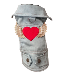 - **Decoratie:** Het jasje is voorzien van een opvallende patch met een gedurfde rode hart, omringd door elegante gouden vleugelontwerpen. De parelversieringen voegen een luxe en speelse touch toe, waardoor je hondje de show steelt.