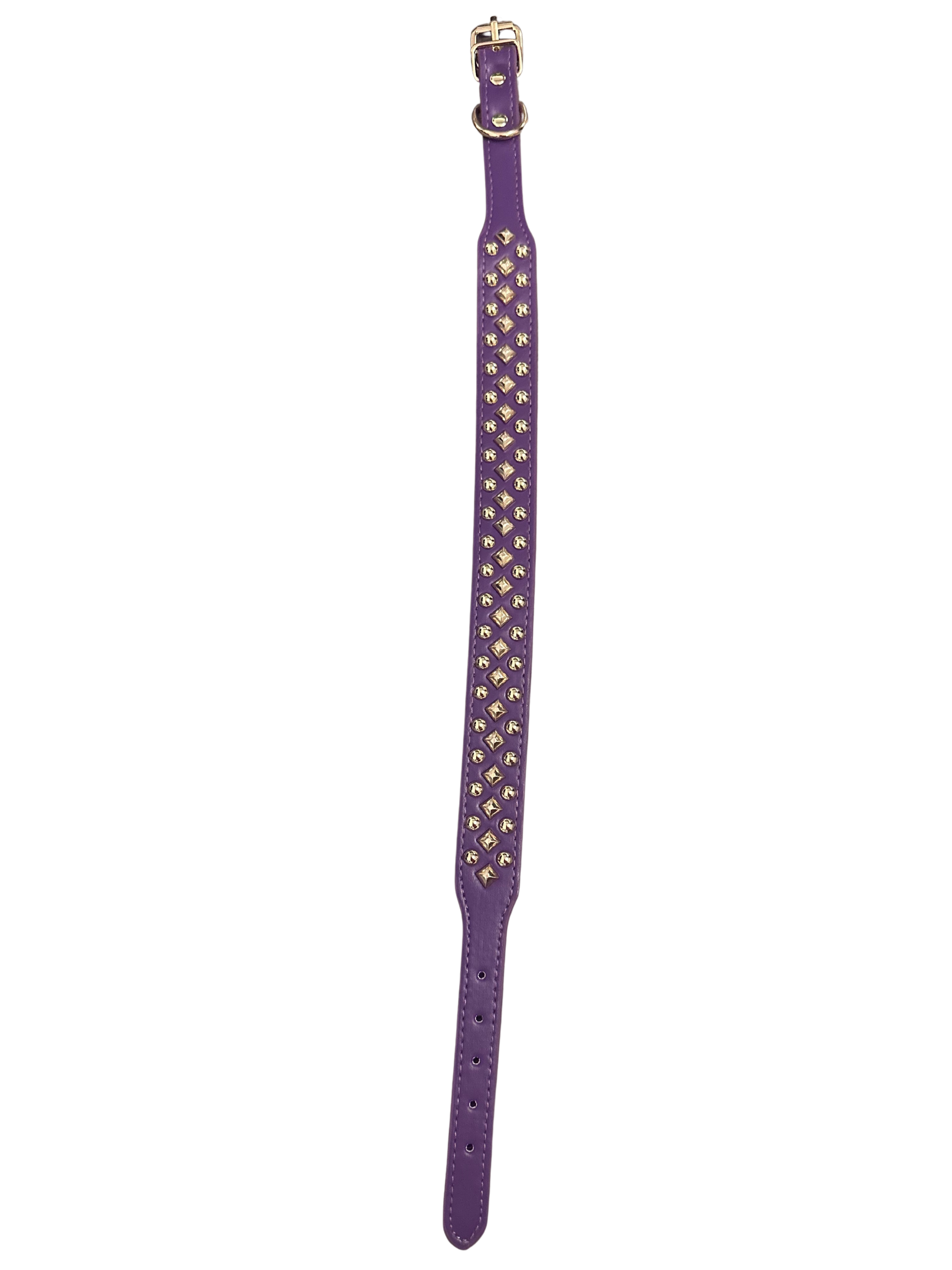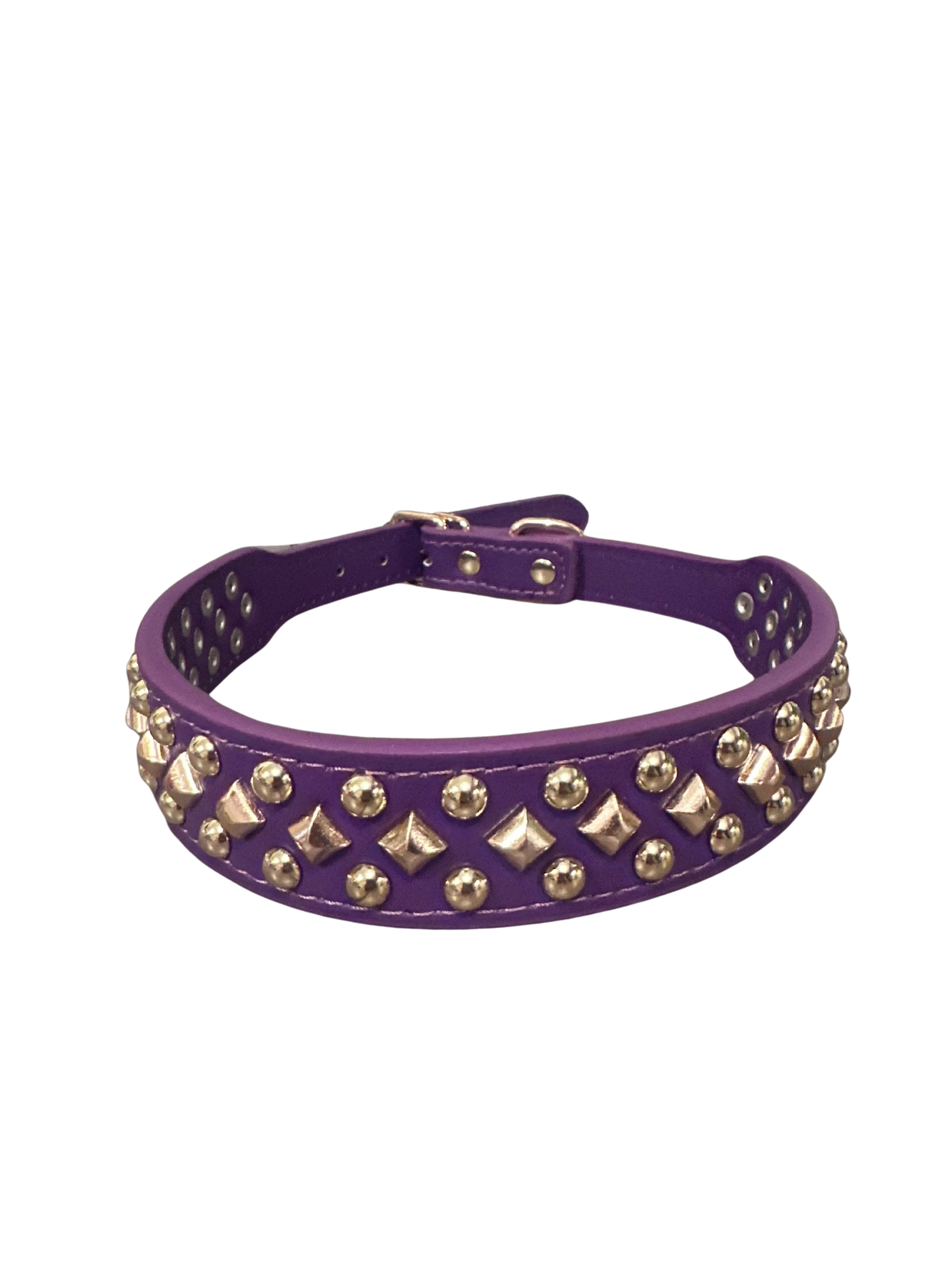Geef je trouwe viervoeter een edgy uitstraling met onze prachtige paarse leren halsband, versierd met metallic studs. Deze halsband is niet alleen een mode-statement, maar ook praktisch en comfortabel door de verstelbare gespsluiting.