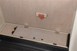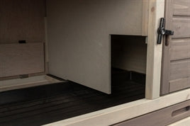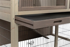 De onderkant heeft een houten achterzijde en gepoedercoat metalen traliewerk aan de overige drie zijden, met twee traliedeuren met dubbele vergrendeling aan de voorkant en zijkant. De bovenste verdieping heeft een deur met tralies en een houten deur wat zorgt voor schuilmogelijkheid. De bodemplaat is een uitschuifbare lade van kunststof. De dak delen zijn bedekt met asfaltpapier en van bovenaf te openen.
