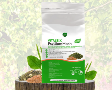 Vitalbix Psylliummash is een gezonde slobber met 50% psylliumzaadjes. een unieke manier om eenvoudig een (maandelijkse) zandkuur te geven, geschikt voor ieder paard. De slobber is gemaakt op basis van timothee gras en bevat geen luzerne. dankzij het lage zetmeel- en suikergehalte (totaal 4,9%) en de goede verteerbaarheid is Vitalbix Psylliummash een verantwoorde keuze, ook voor paarden die behoefte hebben aan een laag zetmeel- en suikerrantsoen. Bovendien is het zeer smakelijk, makkelijk in gebruik en snel klaar.
