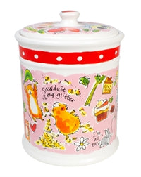 De voorraadpot is wit met een roze achtergrond en rode band. Ook op het deksel is een leuke opdruk geplaatst. De voorraadpot is magnetron en vaatwasser bestendig en mag niet ontbreken in elk dierenhuishouden!